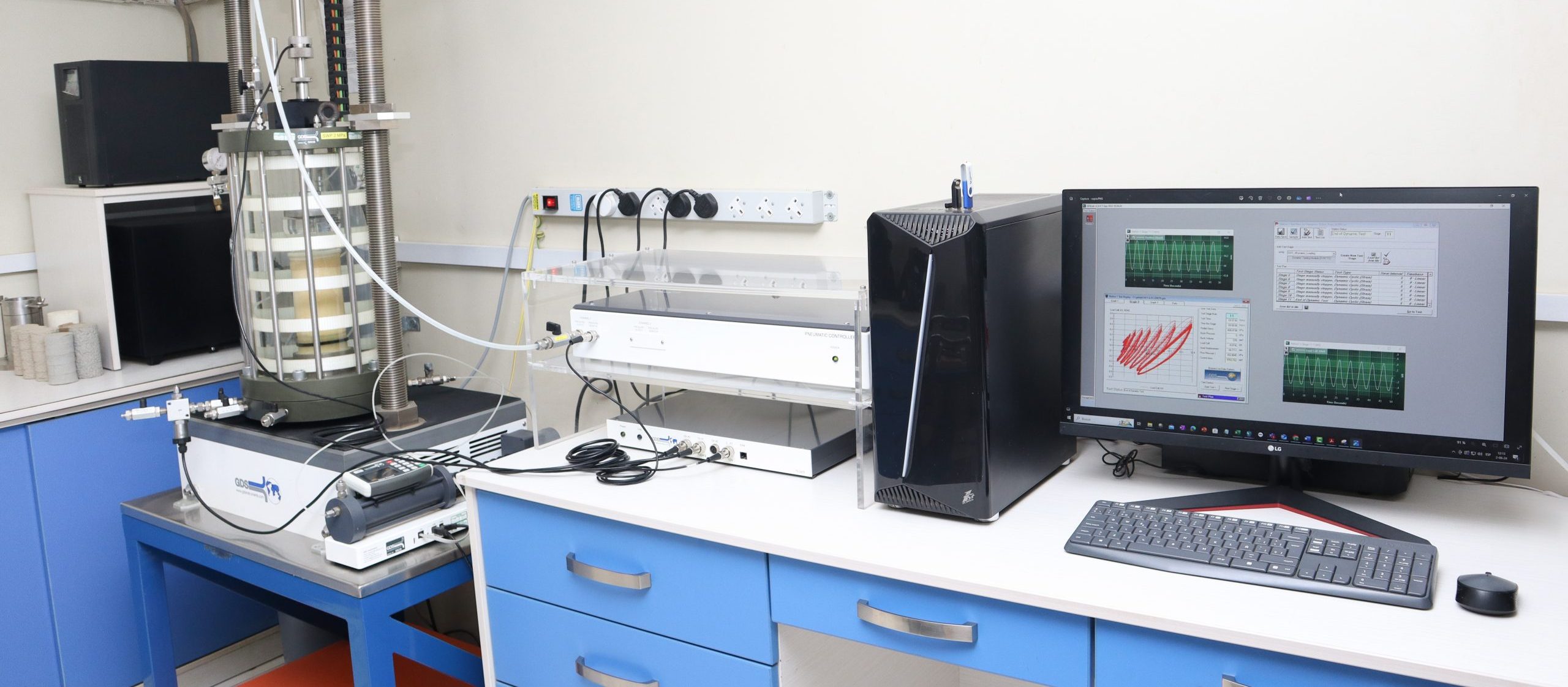 - Soil dynamic properties, Young’s Modulus, and damping ratio (ASTM D3999): Capability to perform tests under either load or strain control.